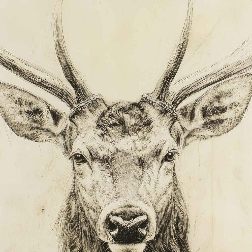 Der Kunststil erinnert an die großen Naturforscher-Illustrationen des 19. Jahrhunderts, mit ihrer präzisen Linienführung und meisterhaften Schattierungen. Die Technik zeigt feine Schraffuren und weiche Übergänge, die dem Hirschfell eine realistische Textur verleihen. Der minimalistische Ansatz konzentriert sich ganz auf das Wesentliche und lässt den Hirsch als kraftvolles Naturwesen in den Vordergrund treten.