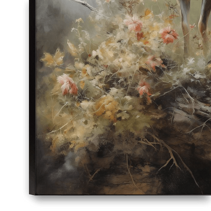 Ein stolzer Rothirsch erscheint am Waldrand, sein imposantes Geweih zeichnet sich scharf gegen den weichen Nebel ab. Inmitten von Herbstlaub und warmen Farbtönen strahlt er Ruhe, Wachsamkeit und Stärke aus. Ein Kunstwerk, das den Zauber der Natur und die Würde dieses majestätischen Tieres perfekt einfängt.