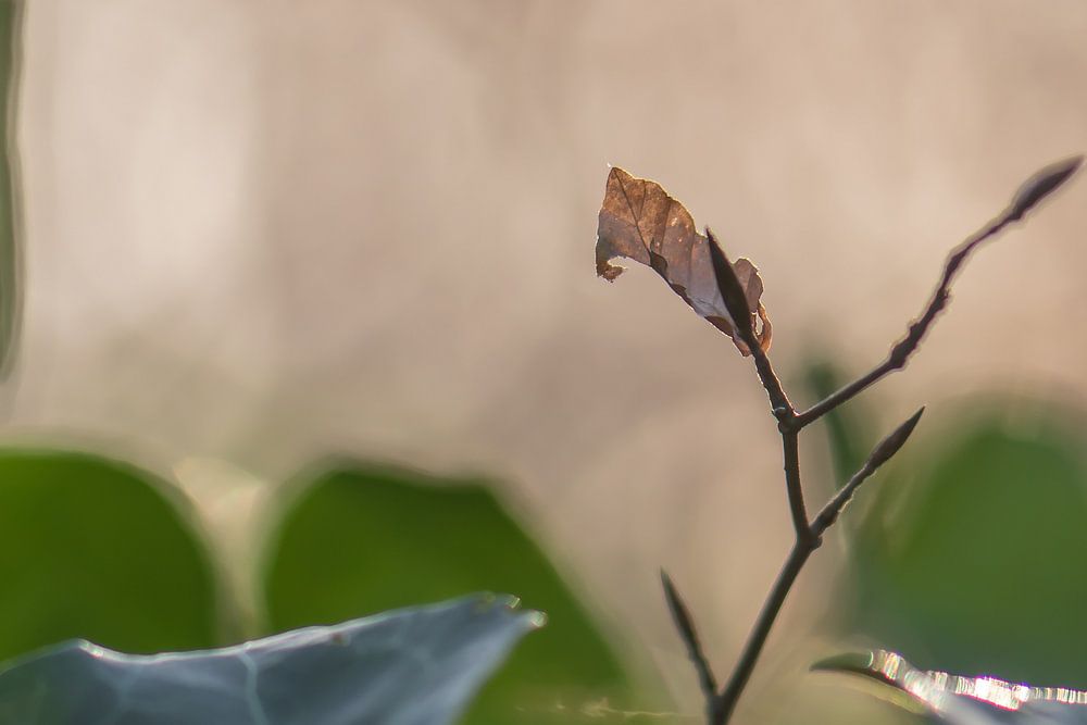 Nahaufnahme von grünen Efeublättern im Sonnenlicht, wo ein trockener Zweig herausragt, und einem Bokeh-Hintergrund.