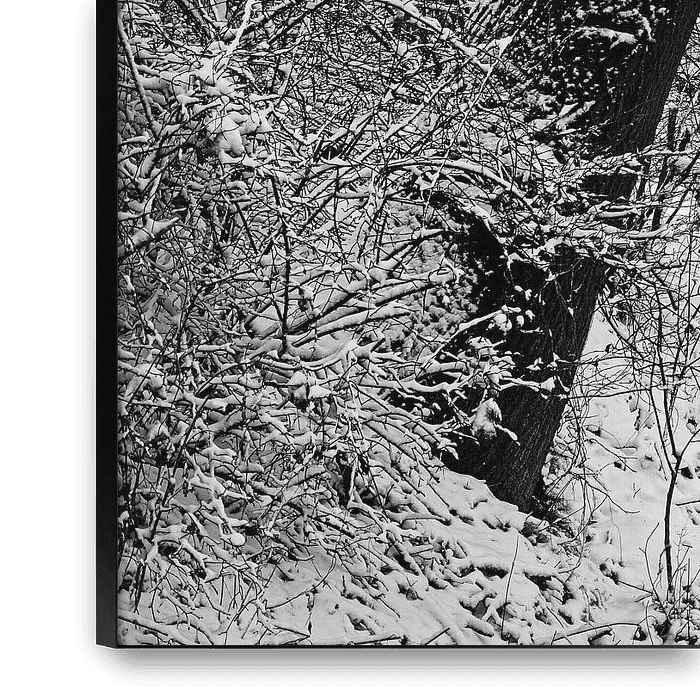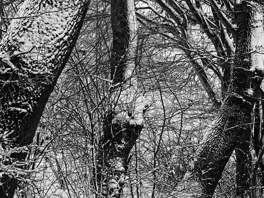 Kontrastreiches Schwarz-Weiß-Foto von Eichen in den südlimburgischen Hügeln bei Eys nach einem Schneefall.