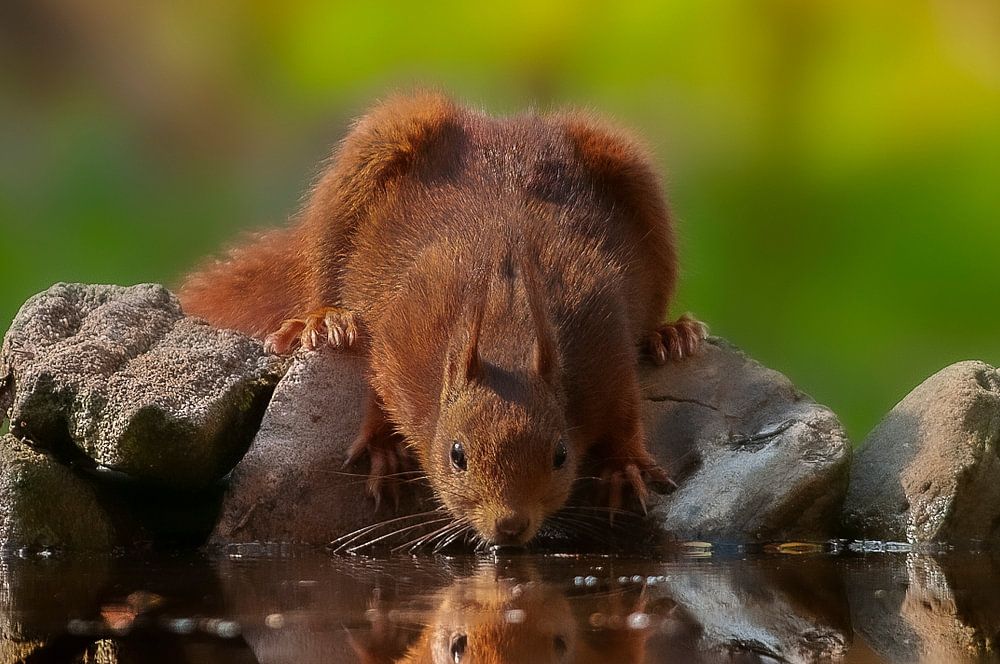 Dieses Eichhörnchen trinkt im Wald in der Nähe eines schönen ruhigen Teichs. Durch die wenigen Wellen auf dem Wasser ist die Spiegelung des Eichhörnchens gut zu erkennen. Ein schönes buntes Bild für die Wand.