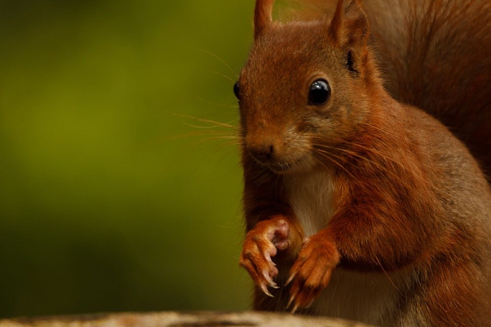 Eichhörnchen auf Baumstumpf. Schöne dunkle Farben in der Landschaft. Schärfe und Tiefe kommen gut zur Geltung. Schön zum Aufhängen an der Wand. Schöner Kontrast auf dem Foto.