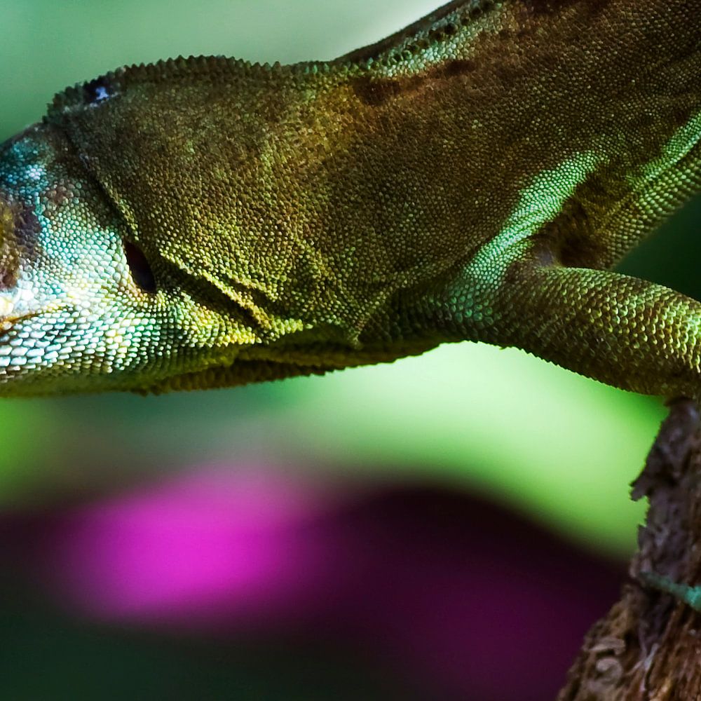 Nahaufnahme-Porträt einer Eidechse auf einem Baum im Dschungel von Tobago. Ein Dschungel in der Karibik.