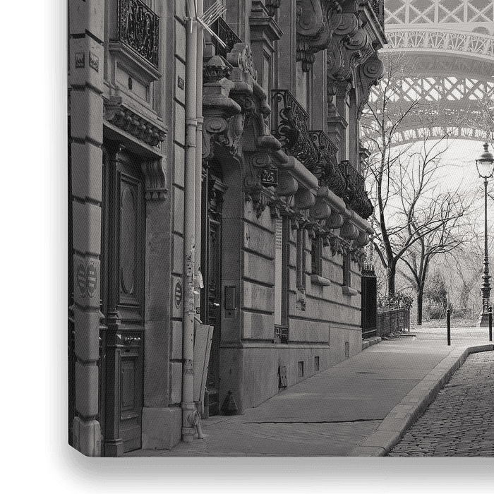 Der Eiffelturm fotografiert an einem sonnigen Morgen von der Rue de l'Université in der Nähe der Champs de Mars. Das schöne Wohnhaus bildet einen interessanten Kontrast zum Wahrzeichen von Paris.