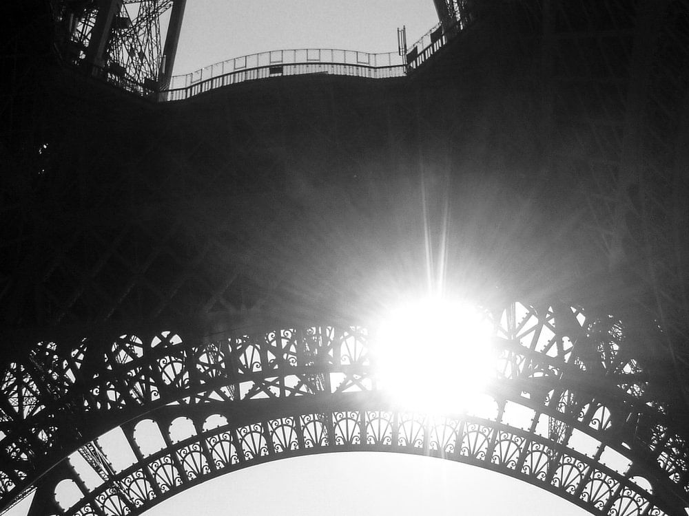 Zwart wit foto van de Eiffeltoren in Parijs van onderaf gefotografeerd. Een close up van het geraamte van het onderste deel van de toren.