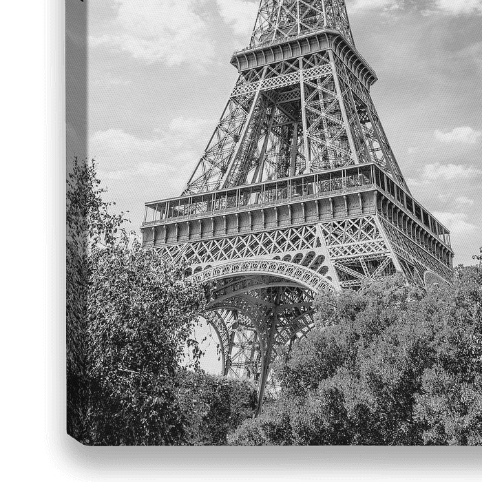 Der Eiffelturm in Paris in schwarzweiß an einem schönen Tag im Sommer