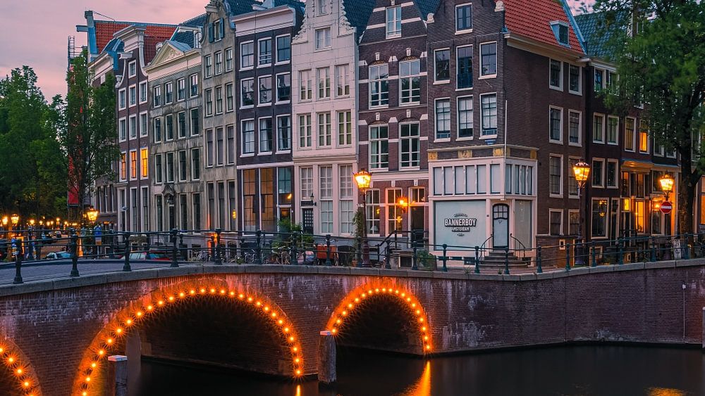 Ein Sommerabend im Zentrum von Amsterdam mit Blick auf die berühmte Kreuzung von Keizersgracht und Leidsegracht mit beleuchteten Brücken und den schönen Grachtenhäusern.