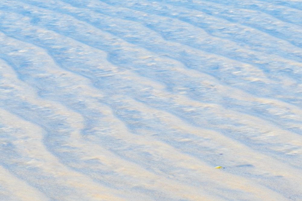 Ein Abriss des Strandes. Das Foto ist so aufgenommen, dass es das Gefühl des Strandes vermittelt. Besonders die Blautöne mit dem Sand bestimmen das Bild.