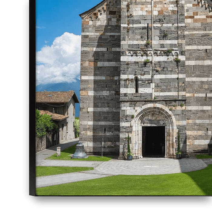 Ein Blick auf die Kirche von Gravedona am Comer See im Sommer unter blauem Himmel.