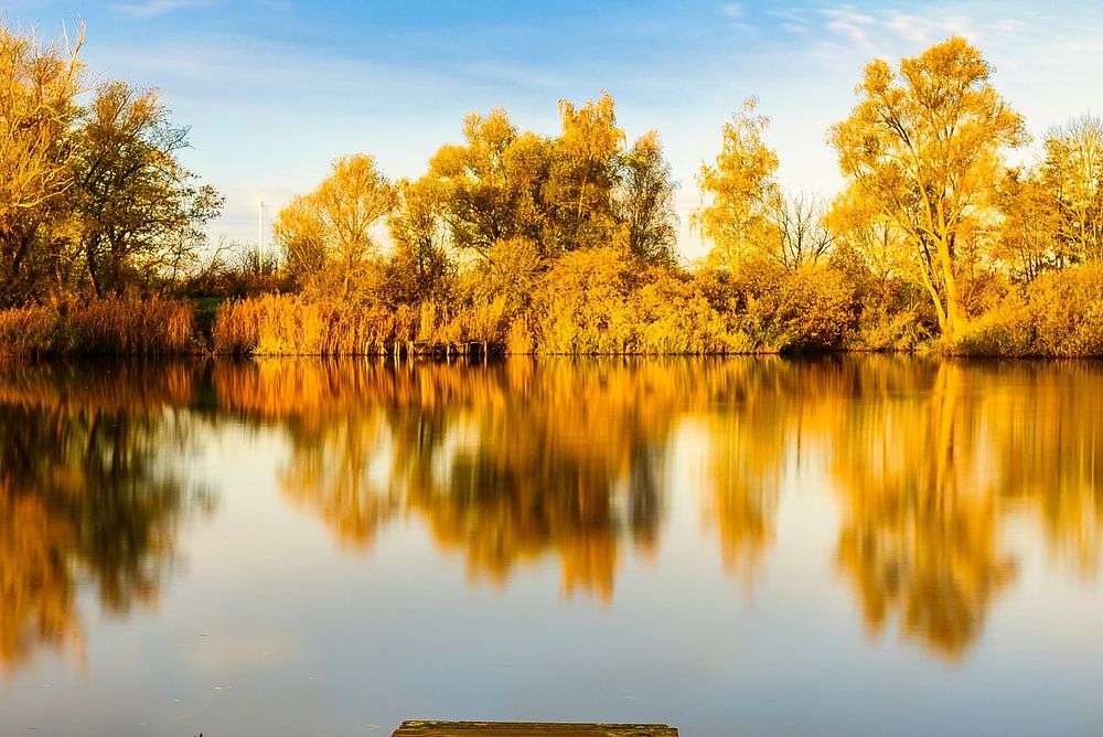 Ein Blick auf einen Steg im See bei Sonnenaufgang im Wald mit Herbstfarben