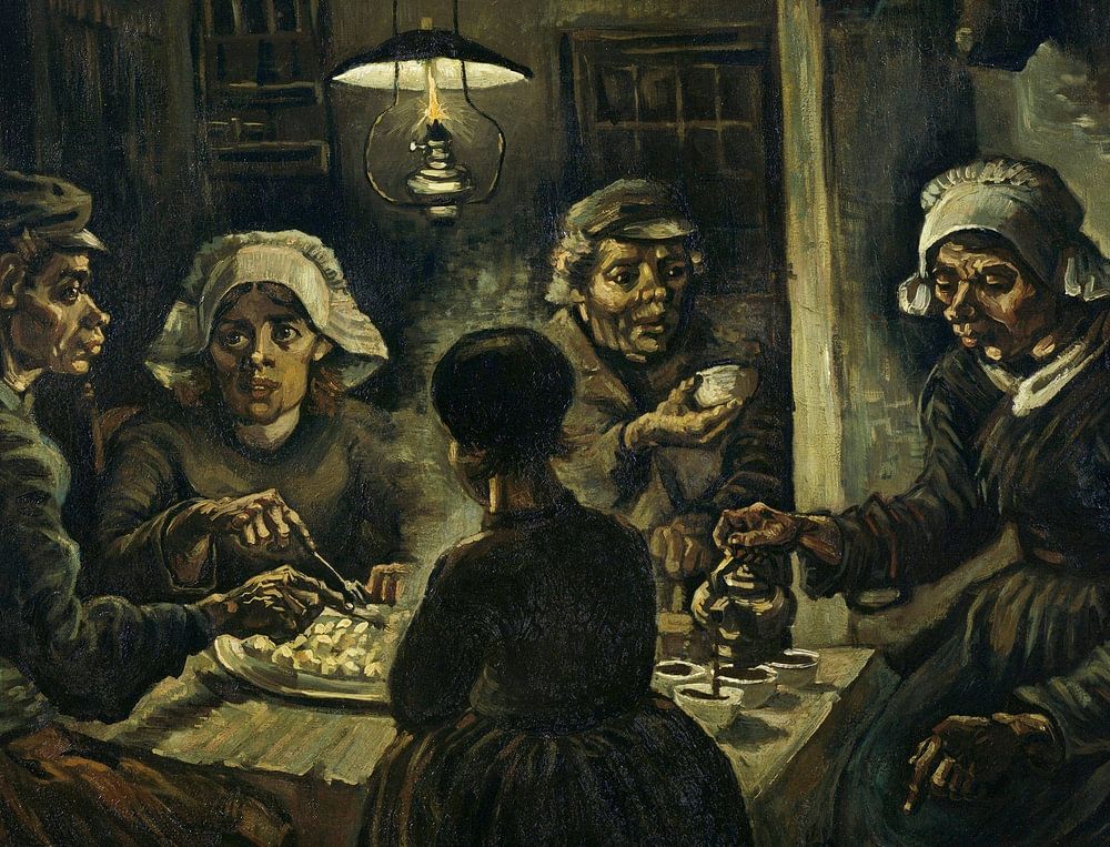 So begann Vincent sein Meisterwerk: "Die Kartoffelesser". Mit kräftigen Pinselstrichen und tiefen Farben erweckte er die Szene zum Leben. Fünf Figuren saßen um einen einfachen Tisch, der vom sanften Schein einer Öllampe beleuchtet wurde. Ihre vom Leben gezeichneten Gesichter strahlten eine gewisse Aufrichtigkeit aus. Sie teilten sich eine einfache Mahlzeit aus Kartoffeln, die sie mit rauen Händen schälten und aßen. Es war eine Szene der Demut, aber auch der Würde und Verbundenheit.