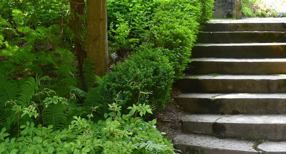 Ein Gartenweg im Sommer, Métis, Quebec, Kanada