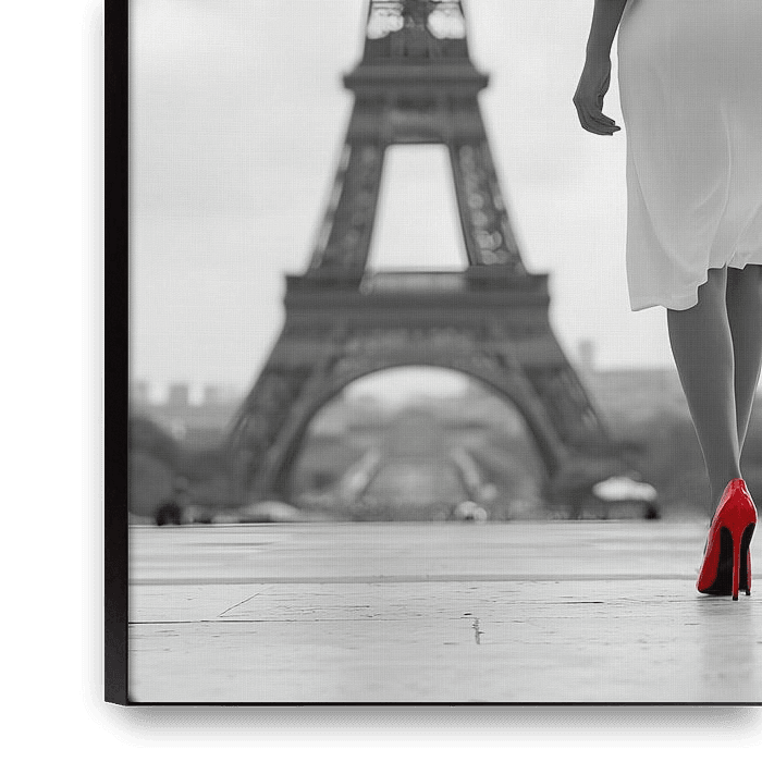 Eine elegant gekleidete Frau schreitet von hinten auf den Eiffelturm zu. Das Bild ist nahezu monochrom gehalten; nur ihre roten High Heels setzen einen starken farblichen Akzent. Der große Hut und das schlichte Kleid verleihen ihr zeitlose Pariser Eleganz. Die weiche Unschärfe im Hintergrund verstärkt die Tiefe und lenkt den Blick auf…