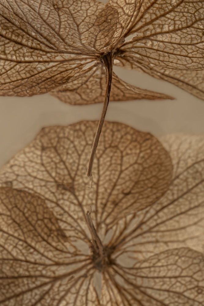 "Ein Hortensienblatt mit Spiegelung in Brauntönen" ist ein Makrofoto eines Hortensienblattes, das bereits teilweise verrottet ist, so dass man die Aderstruktur des Blattes sehr schön erkennen kann. Wenn Sie das Bild vergrößern, können Sie die Aderstruktur an den beiden oberen Blättern gut erkennen. Die Blätter sind sehr zerbrechlich und dünn, so dass die Adern schön zur Geltung kommen.