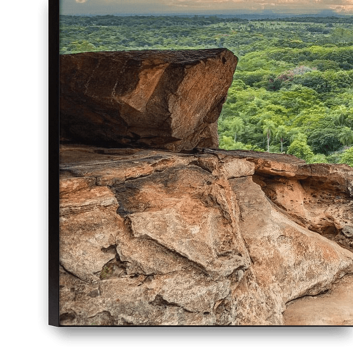 Bestelle dieses Landschafts-Wandbild Ein Mann unter dem Felsbogen am Cerro Arco in Tobati in Paraguay. von Jan Schneckenhaus als Reproduktion auf Leinwand, Alu-Dibond, als Poster, Fototapete oder Acrylglasbild.