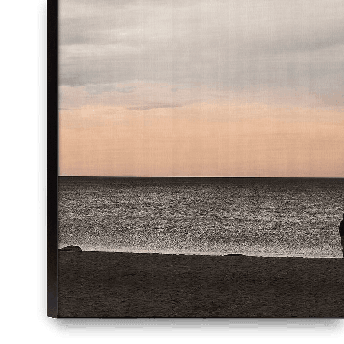 Bestelle das Foto Ein Mensch steht am Strand und genießt nachdenklich die Abendstimmung am Meer von Michael Moser als Reproduktion auf Leinwand, Alu-Dibond, als Poster, Fototapete oder Acrylglasbild.