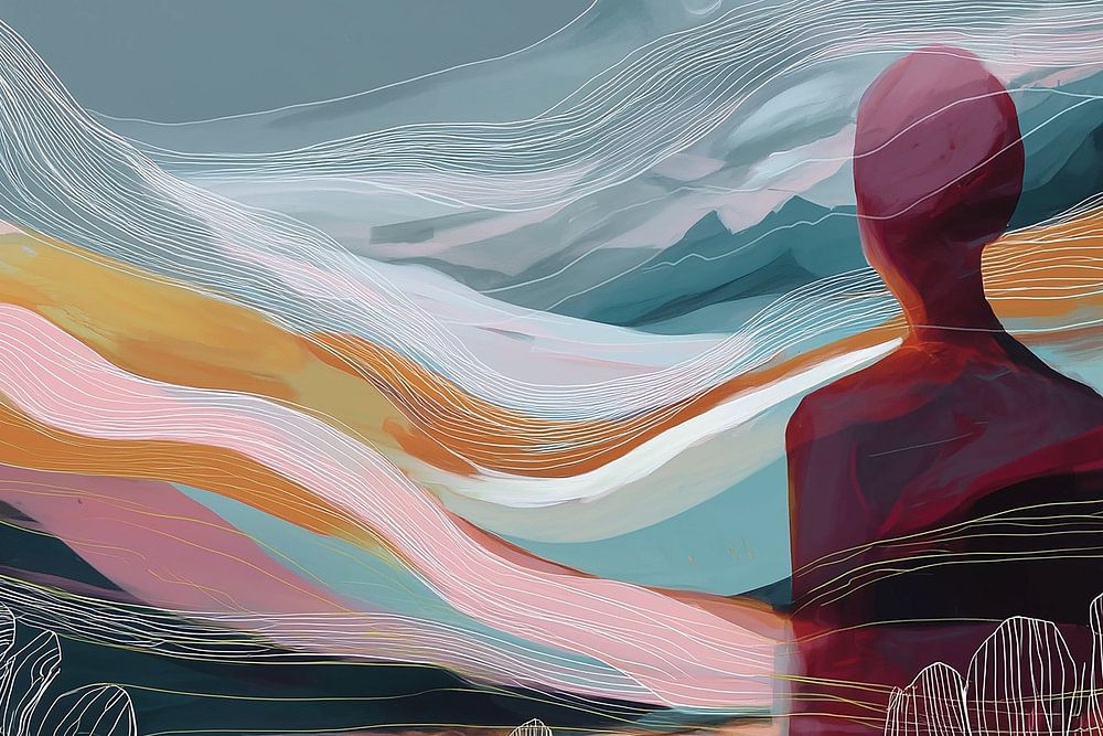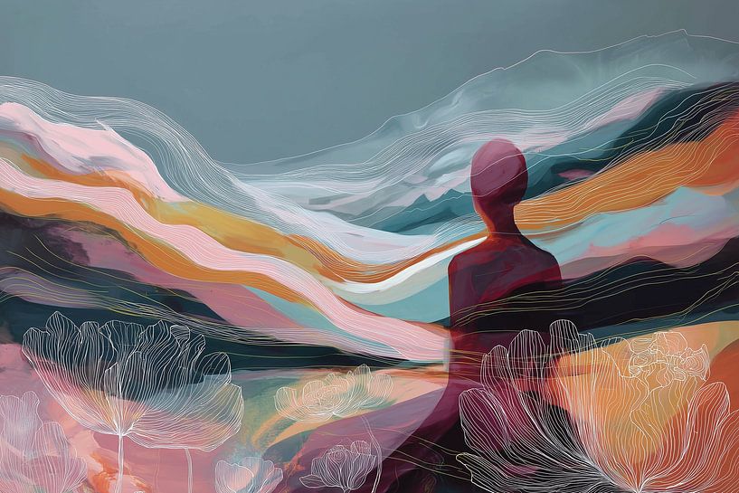 Moment of Reflection zeigt ein stilles Zusammenspiel von Mensch und Landschaft, bei dem eine Silhouette von hinten in die geschichteten Formen von Hügeln und Tälern übergeht. Die Figur ist nicht von ihrer Umgebung getrennt, sondern scheint mit dem Land, das sie umgibt, eins zu werden. Ihre Präsenz ist still, fast transparent, als ob sie…