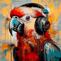 Bestelle dieses Popart-Wandbild Ein Papagei liebt Musik! von Marjolein Deelen als Kunstdruck auf Leinwand, Alu-Dibond, als Poster, Fototapete oder Acrylglasbild.