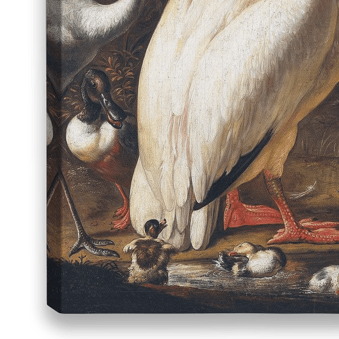 Bestelle Ein Pelikan und andere Vögel auf dem Wasser, Umkreis von Melchior d'Hondecoeter als Reproduktion auf Leinwand, Alu-Dibond, als Poster, Fototapete oder Acrylglasbild.