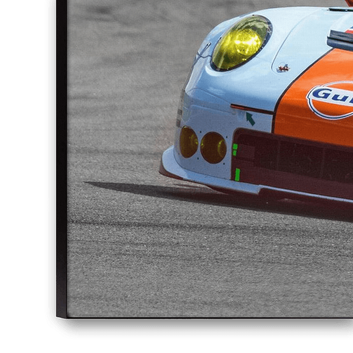 Porsche 911 RSR GTE Rennwagen von Gulf Racing bei der Einfahrt in die La Source Hairpin während des Sechs-Stunden-Rennens in Spa-Francorchamps 2016.