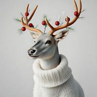 ein minimalistisches Porträt eines Rentiers mit Geweih, geschmückt mit Weihnachtsschmuck und weißem Wollpullover auf einem weichen, hellbeigen, weißen Hintergrund.