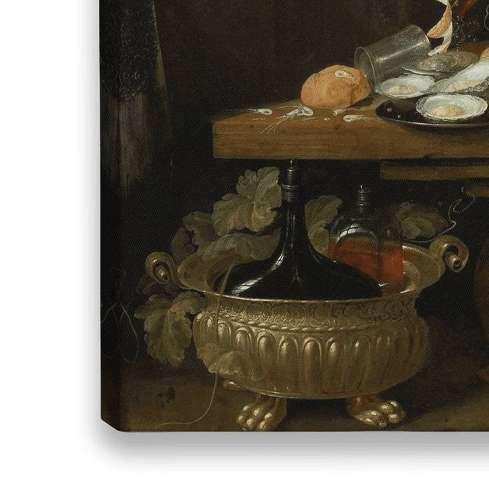 Benedetti war ein Schüler von Jan Davidsz. de Heem, dem der prächtigste Typus des barocken dekorativen Stilllebens zugeschrieben wird. In einem eleganten architektonischen Rahmen mit Säulen und Draperien steht ein reich gedeckter Tisch mit Samt- und Damasttüchern. Die teuren Früchte, die mit Getränken gefüllten Metall- und Glasgefäße, die verlockenden Austern und riesigen Hummer, die sich in einer dynamisch komponierten Gruppe auf dem Tisch drängen, symbolisieren Reichtum, Luxus und die Freuden des irdischen Lebens; doch hier und da deutet ein verstecktes Motiv auf ihre Vergänglichkeit hin. So sind ein umgestürzter Abendmahlskelch und das daneben stehende Brot in der Tischecke eucharistische Symbole.