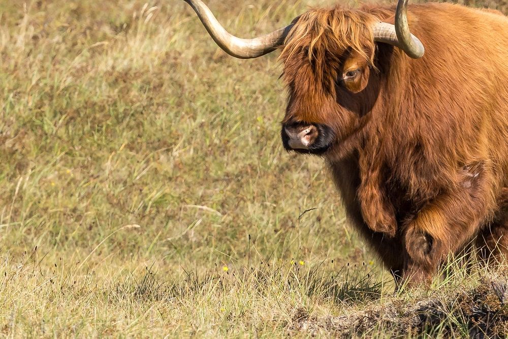 Ein schottischer Highlander mit einem Paar schöner Hörner steht in den holländischen Dünen, um die natürliche Beweidung der Dünen zu gewährleisten.