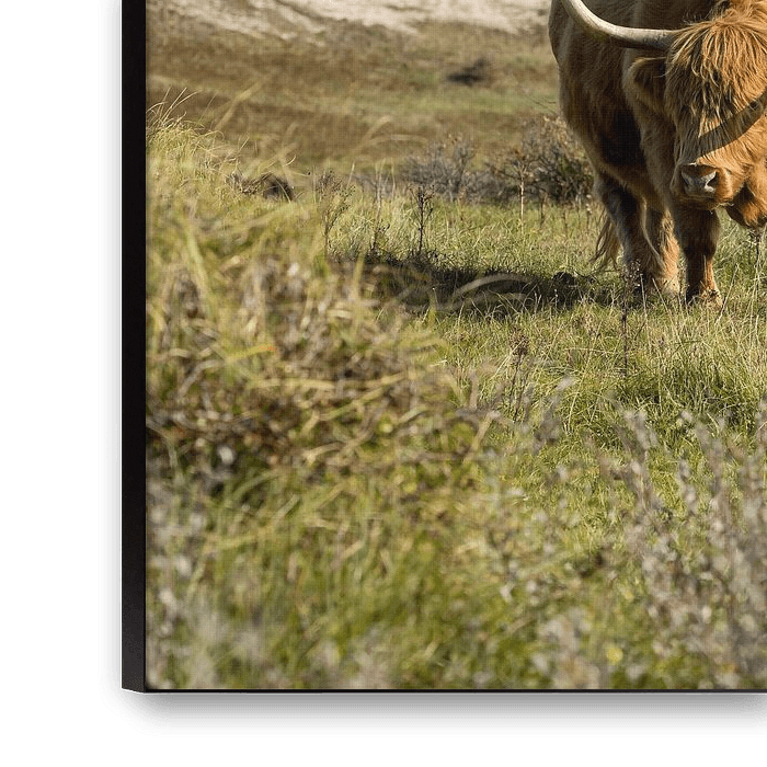 Ein schottischer Highlander mit einem Paar schöner Hörner steht in den holländischen Dünen, um die natürliche Beweidung der Dünen zu gewährleisten.