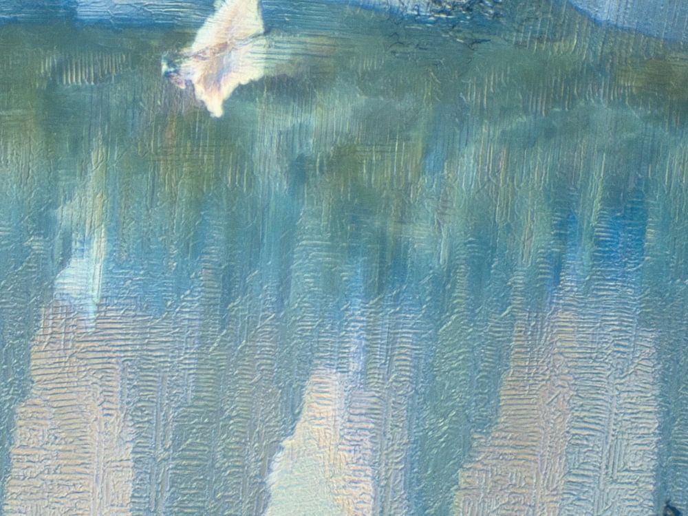 Ein impressionistisches Bild eines Sees mit Spiegelungen, möglicherweise Hügeln und rechts eine Figur, die einen Fischer darstellen könnte. Hergestellt mit Harnstoff und Resorcin-Kreiden durch ein Miscroscope.