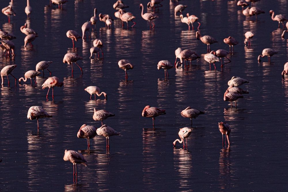 Ein See voller rosafarbener Flamingo's. Ein schönes Glitzern im Wasser durch die tiefstehende Sonne in Kombination mit dem dunklen Himmel.