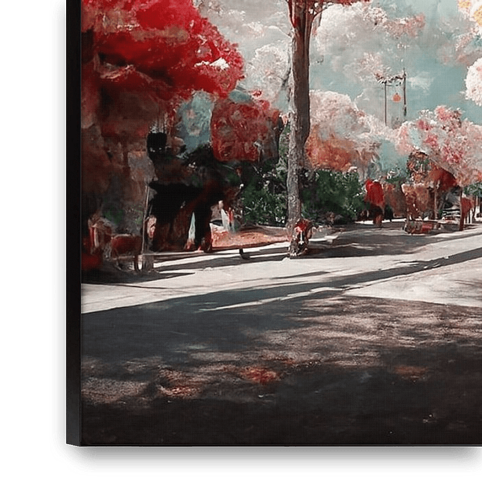 Ein Straßenzug mit Bäumen aus Zuckerwatte und Bonbons laden zum Träumen und Verweilen ein. An einem schönen Sommertag sind die Menschen unterwegs. Die Fantasielandschaft bringt gute Laune mit den kräftigen Farben. Die abstrakte Stadt ist ein Blickfang, bei der es immer neue Details zu entdecken gibt.