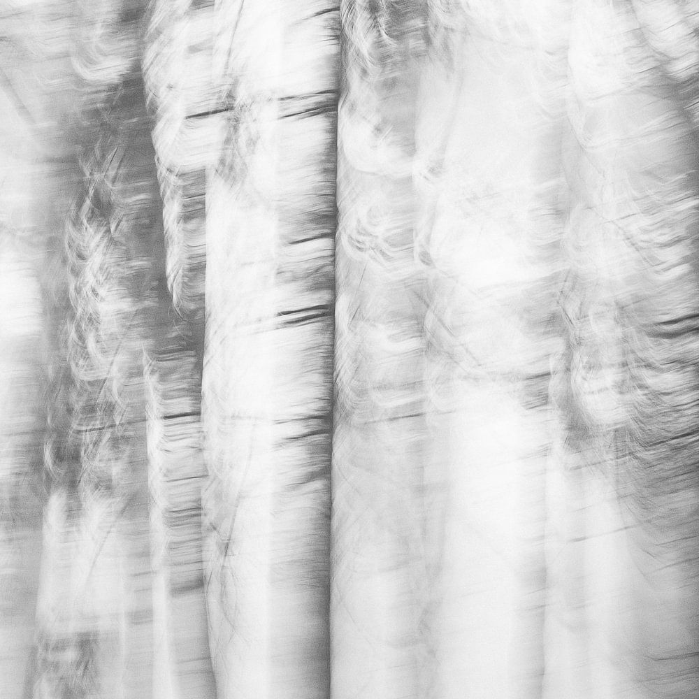 Ein Schwarz-Weiß-Winterfoto aus den Niederlanden mit einer nebligen Landschaft und sich bewegenden Bäumen im Wald, auch bekannt als ICM (Intentional Camera Movement). Diese Technik verleiht dem Bild einen minimalistischen und romantischen Look.