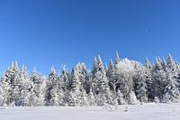 Bestelle das Foto Ein eisiger Wald unter blauem Himmel von Claude Laprise als Reproduktion auf Leinwand, Alu-Dibond, als Poster, Fototapete oder Acrylglasbild.