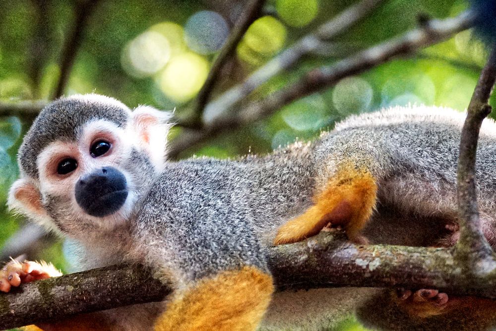 Dieses Totenkopfäffchen (Saimiri) kommt jeden Morgen an einer bestimmten Stelle im Wald mit dem Rest seiner Familie von den Baumwipfeln herunter, um sich Bananenstücke zu holen.