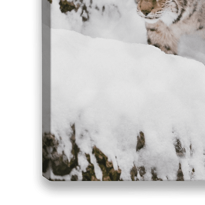 Bestelle das Foto Ein ernsthafter Jäger, der Luchs galoppiert geschickt über Felsen von Michael Semenov als Reproduktion auf Leinwand, Alu-Dibond, als Poster, Fototapete oder Acrylglasbild.