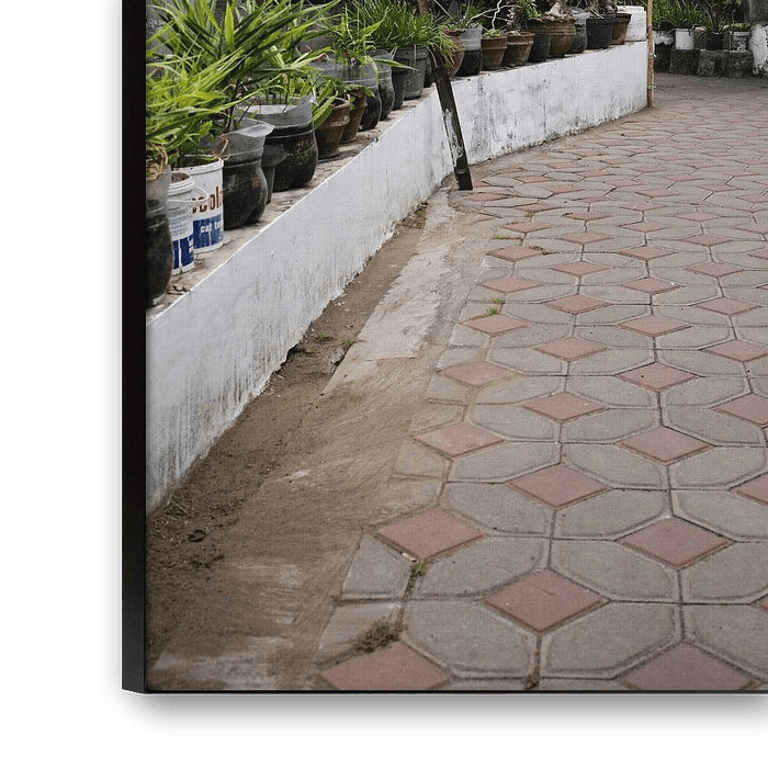 Dieses Foto fängt eine friedliche Gasse in Yogyakarta ein, in der das Alltagsleben bis ins kleinste Detail zum Ausdruck kommt. Der Blick wird von der aufgehängten Wäsche angezogen, die sanft in der warmen Luft schwebt und von einem einfachen und universellen Ritual zeugt: dem Waschen der Wäsche. Die grauen Ziegelwände, die roten Ziegeldächer und die Topfpflanzen, die entlang des Weges aufgereiht sind, schaffen eine Harmonie von Texturen und Farben. Das Fehlen von Figuren betont die Ruhe der Szene und lässt den langsamen Rhythmus des örtlichen Lebens zwischen Licht und Schatten erahnen. Man kann sich vorstellen, wie das Kinderlachen durch die Gasse hallt, die Gespräche der Nachbarn und der Duft des Regens auf der warmen Erde. Diese authentische Aufnahme beschwört die stille Schönheit der alltäglichen Gesten fernab des städtischen Trubels herauf. Es ist ein einfaches und ehrliches Fragment eines Lebens, in dem jedes Detail von der Süße des indonesischen Alltags erzählt.