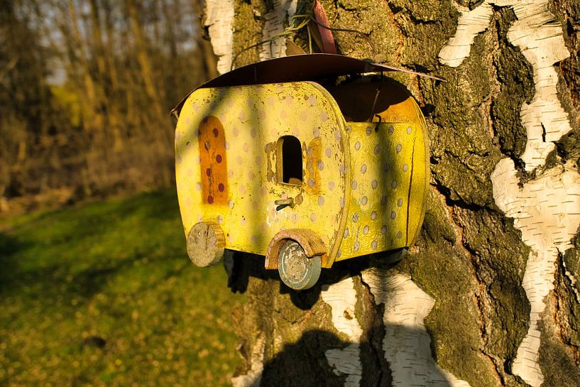 Ein gelbes Vogelhaus in Form eines Wohnwagens, befestigt an einem Baumstamm mit weißer Rinde, im Sonnenlicht. Ideal für Natur- und Gartenliebhaber.