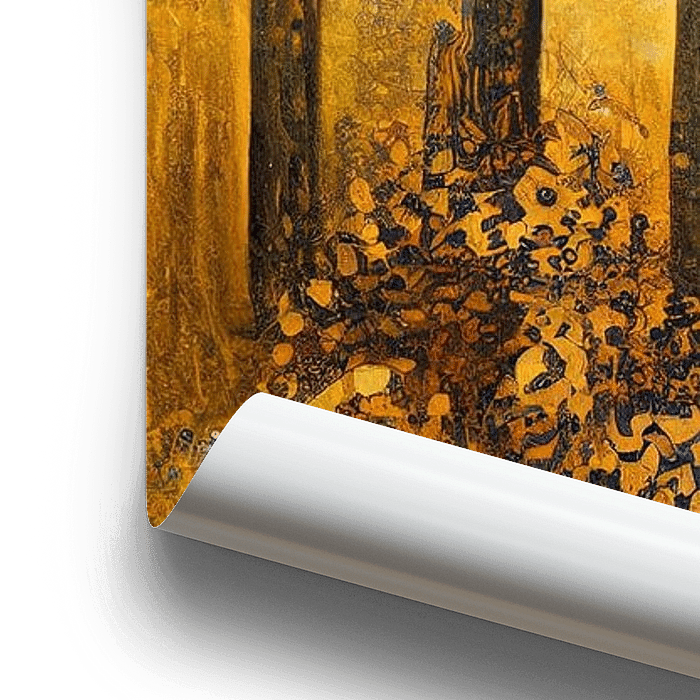 Ein farbenfrohes digitales Gemälde eines nebligen Waldes im Stil von Gustav Klimt. Dieses Werk ist von den Formen und der Farbpalette von "The Kiss" inspiriert. Das Werk verleiht Ihrem Interieur ein warmes und klassisches Aussehen!