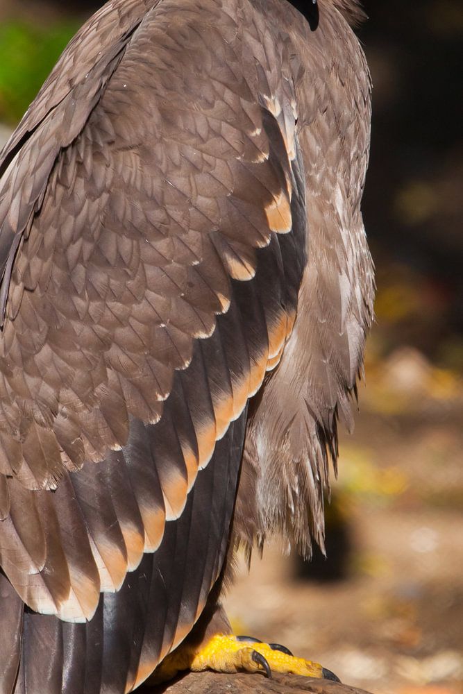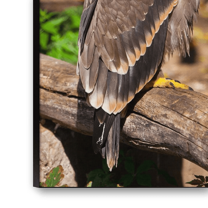 Ein großer Steppenadler sitzt wunderschön von der Sonne geweiht, ein mächtiges Raubtier aus nächster Nähe, ein strenger, aquiliner Blick.