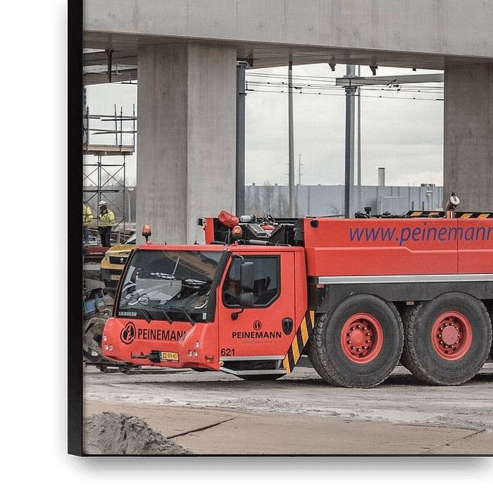 Bestelle das Foto Ein imposanter mobiler Teleskopkran, ein Liebherr LTM 1750-9.1, von der Firma Peinemann. von Jaap van den Berg als Reproduktion auf Leinwand, Alu-Dibond, als Poster, Fototapete oder Acrylglasbild.