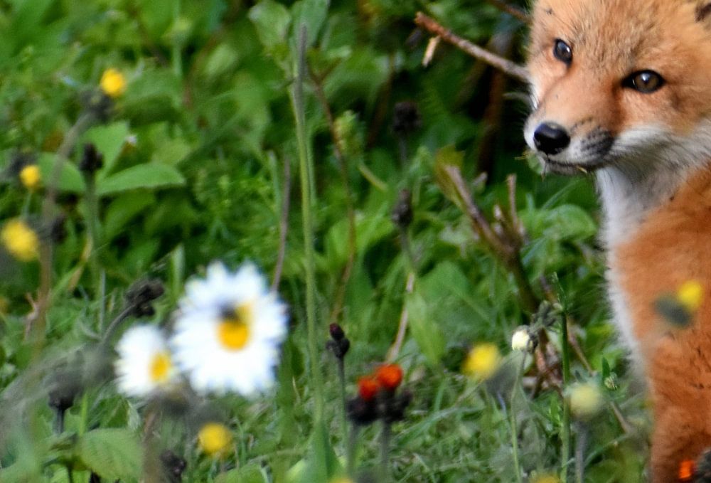 Ein junger Fuchs auf einem Feld im Frühling, Sainte-Apolline, Quebec, Kanada