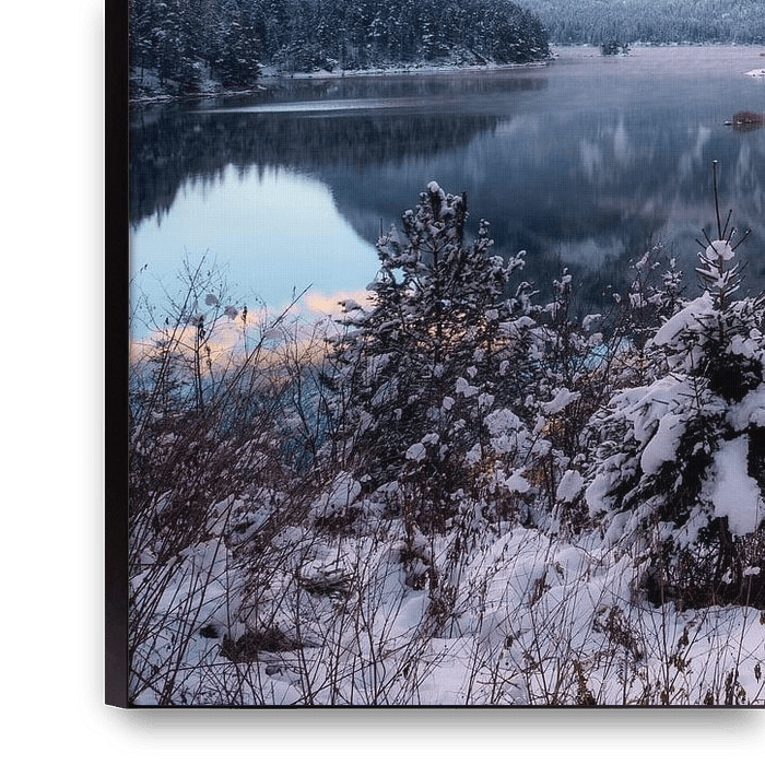 Bestelle dieses Landschafts-Wandbild Ein kalter Wintermorgen am Eibsee von Daniel Gastager als Reproduktion auf Leinwand, Alu-Dibond, als Poster, Fototapete oder Acrylglasbild.