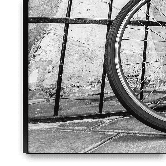 Ein klassisches Fahrrad, abgestellt in einer leeren Straße in der Pariser Altstadt. Der niedrige Bildwinkel bietet eine Perspektive, die die Präsenz des Fahrrads zusammen mit der durch die Schwarz-Weiß-Fotografie bedingten Abstraktion verstärkt.