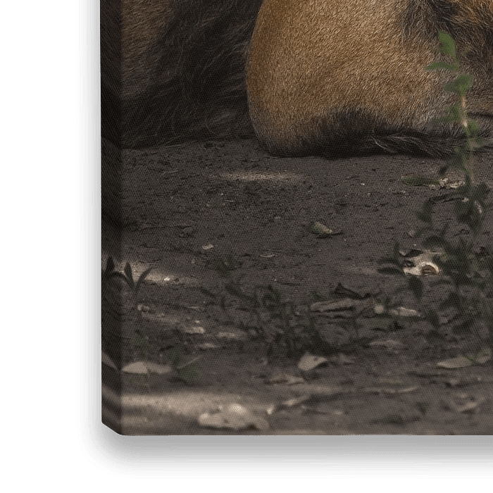 Bestelle dieses Löwen-Wandbild Ein männlicher Löwe mit einer mächtigen Mähne schläft in der Hitze im Dickicht eines dunklen Waldes. von Michael Semenov als Reproduktion auf Leinwand, Alu-Dibond, als Poster, Fototapete oder Acrylglasbild.