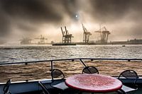 Eine Fährfahrt im frühen Morgenlicht mit rotem Tisch mit Regentropfen und Eis davor und Blick auf die Kräne am Hamburger Elbufer