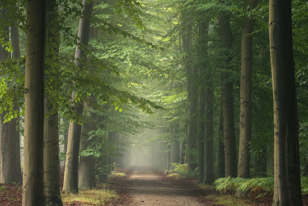 An einem nebligen und wunderschönen Morgen im Wald wurde dieses Bild aufgenommen.