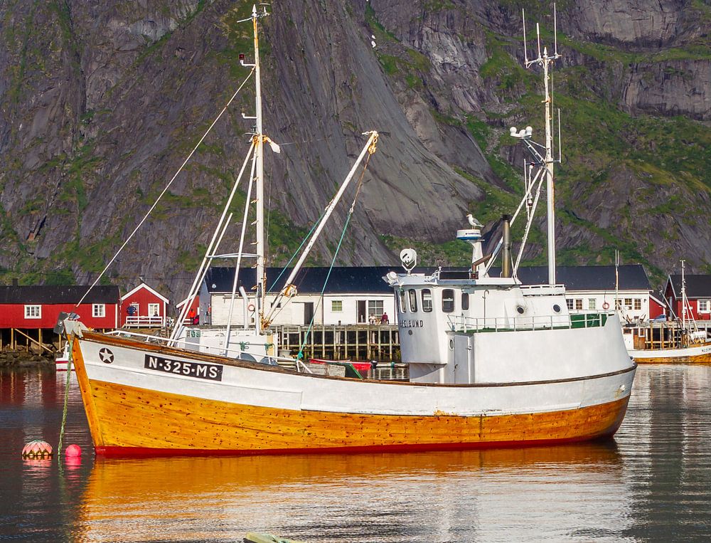 Ein norwegisches Fischerboot im Hafen von Hamnøy auf den Lofoten an einem schönen Sommertag.