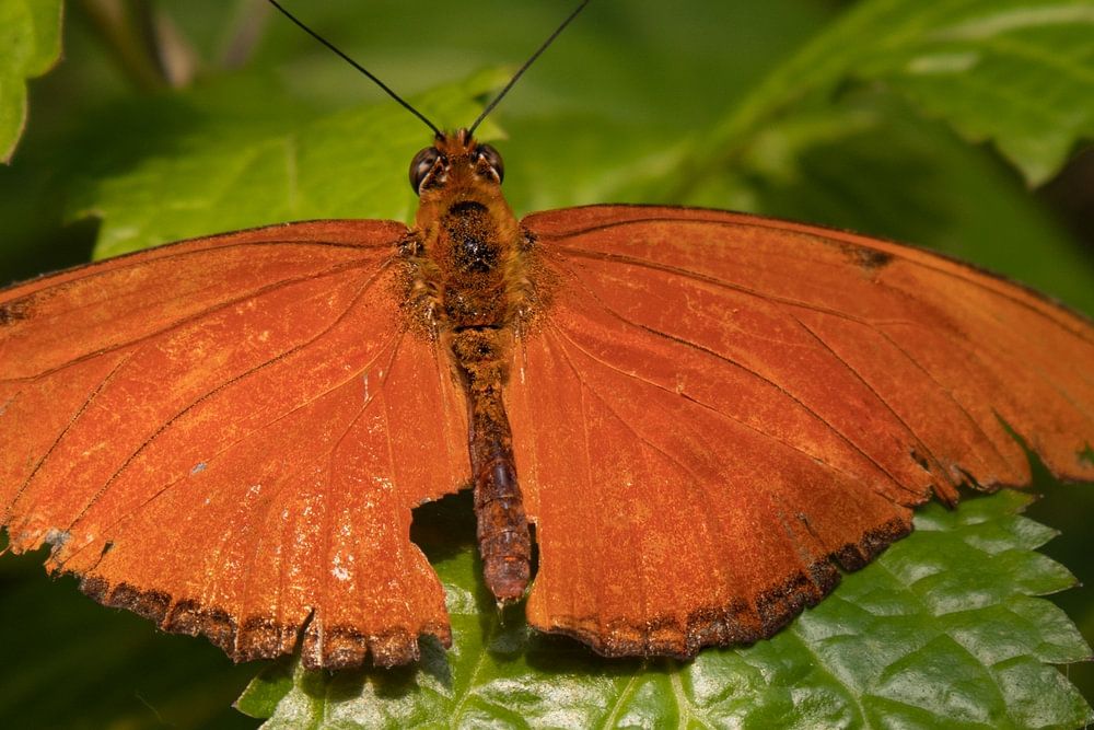 Eine Nahaufnahme eines orangefarbenen Schmetterlings auf einem großen grünen Blatt. Hergestellt im Zoo Emmen.