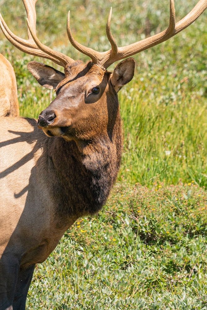 Amerikanische Elche sind sehr große Hirsche mit einem beeindruckenden Geweih. Dieses Männchen zeigt zwischen dem Grasen gerne seine Krone. Vor der Brunft fressen sie sehr viel, denn die Brunft verbraucht viel Energie. Unmittelbar danach folgt der harte Winter in den Rocky Mountains von Colorado. Der Aufbau eines guten Nahrungsvorrats ist also wirklich ein Muss.
