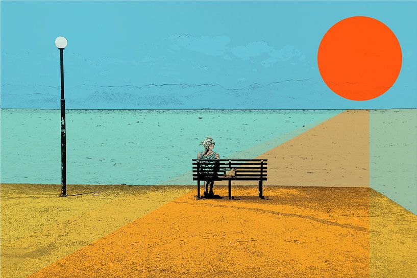 Eine junge Frau sitzt auf einer Eisenbank an einem Kai am Meer. Links eine Laterne. Rechts oben die Sonne. Das Original ist ein selbstbearbeitetes Foto, aus dem ich störende Elemente entfernt und anschließend digital gestaltet und farblich angepasst habe. Eine junge Frau sitzt auf einer Eisenbank an einem Kai am Meer. Links eine…